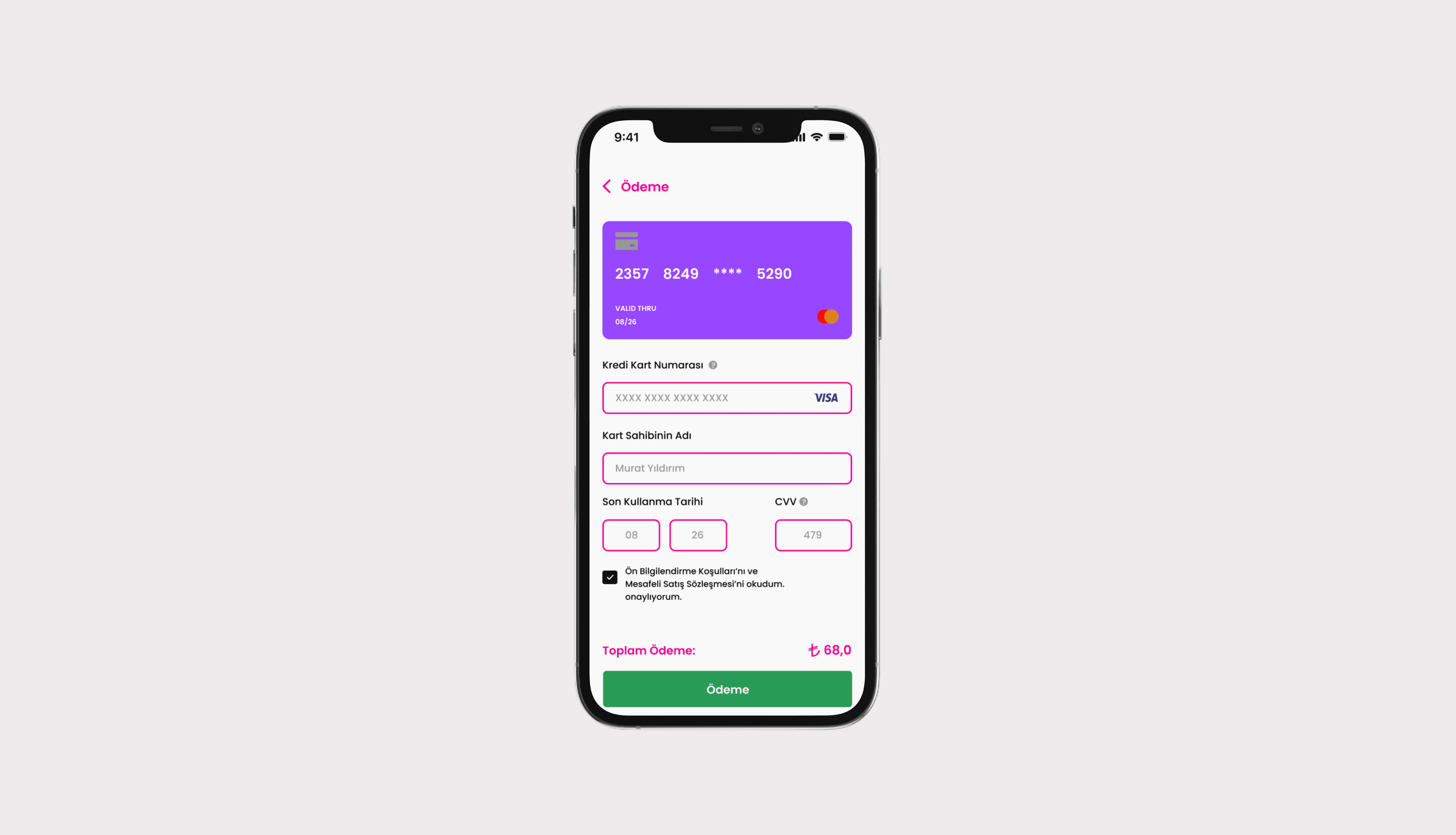 By automatically adding the saved card to the payment screen, users no longer need to re-enter their details. At the same time, spacing between the button and the text was adjusted for clarity. The total payment amount and the payment button were enlarged for better visibility. Users can complete their payment securely without needing to scroll back up.